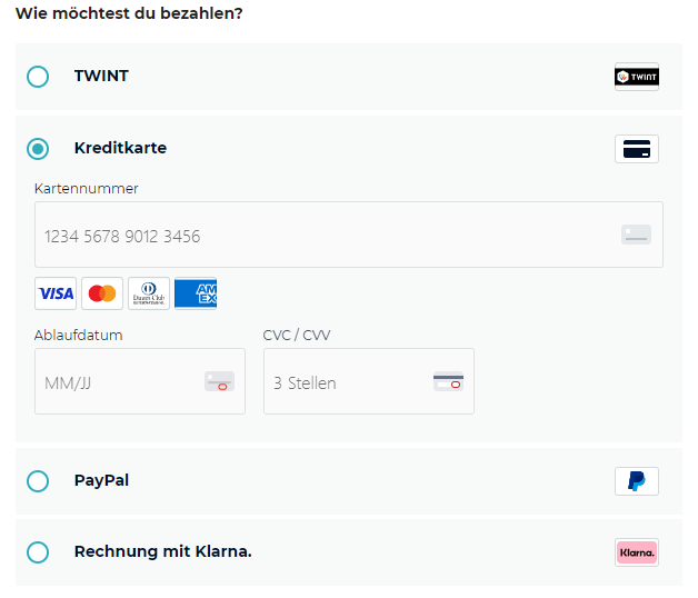 - TWINT: Beliebte Handy-Zahlungsmethode, die mit dem Bankkonto oder den Karten des Käufers über die TWINT-App verbunden ist. Als Käufer zahlen Sie keine zusätzlichen Gebühren.